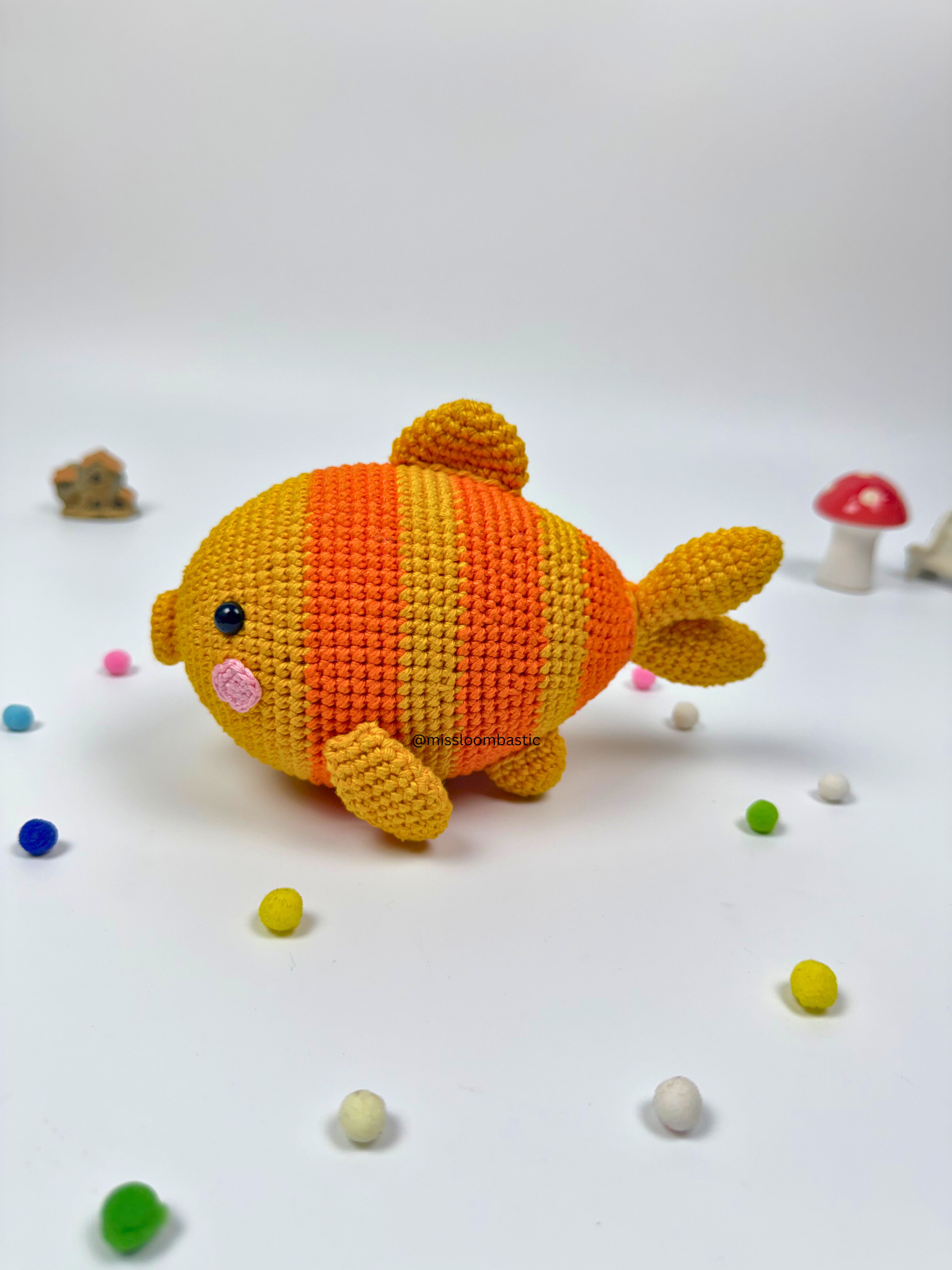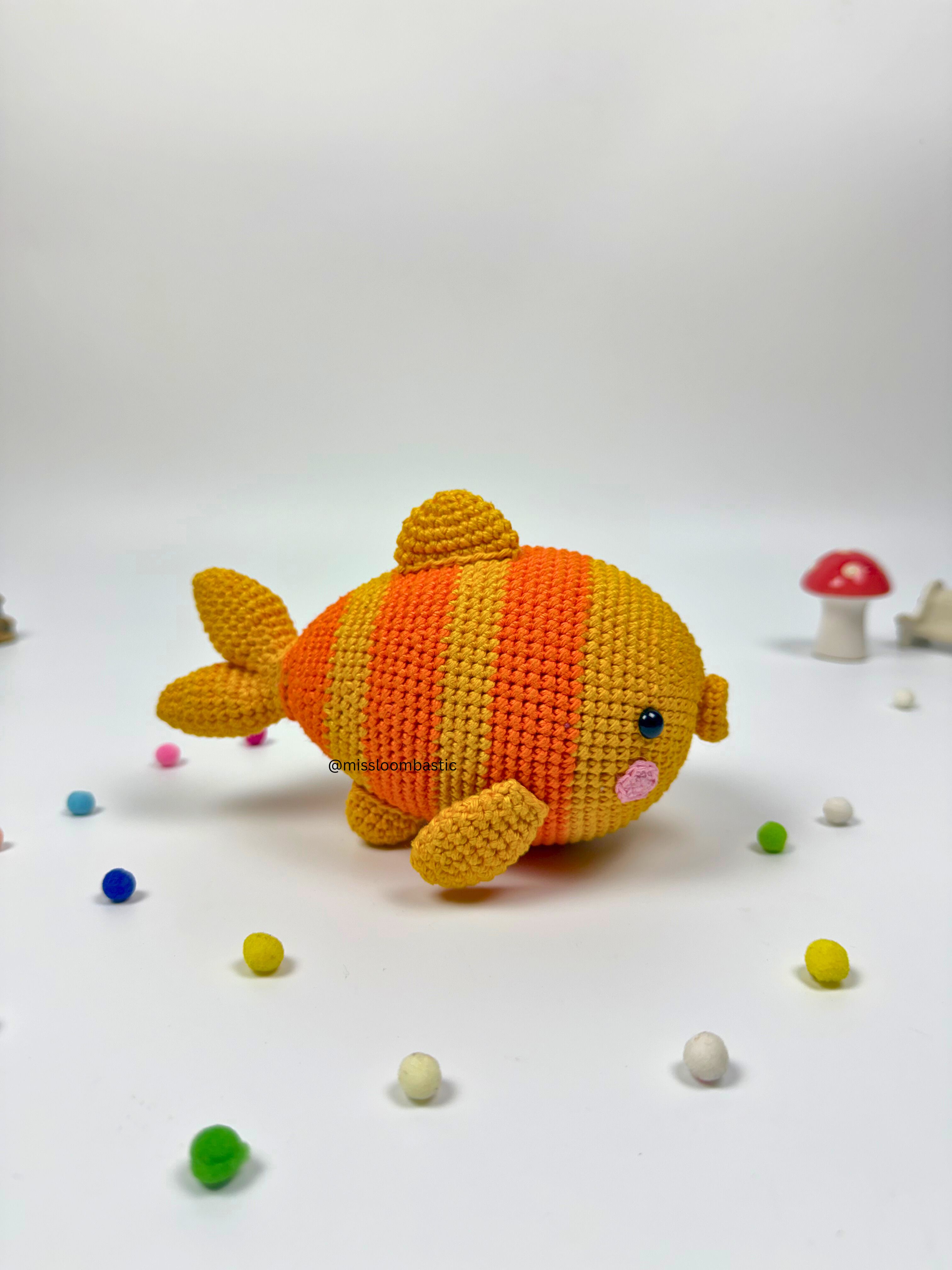 The Tanja Gold Fish Amigurumi is ideal for fans of crochet fish, amigurumi collectibles, and fish-themed crochet gifts. Perfect as a decorative crochet fish, cute home accent, or unique amigurumi gift, it combines playful design and eye-catching craftsmanship, adding personality and charm wherever it goes.